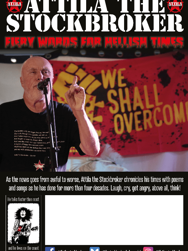 Exploding onto the scene in the early 1980s with John Peel sessions and a Melody Maker front cover, Attila has spent more than four decades performing his unique fusion of punk poetry, dub verse, acoustic song and early music rebellion. With over 4,000 gigs in 24 countries, 20 albums and eight books to his name, he remains one of the UK’s most outspoken and original live performers.