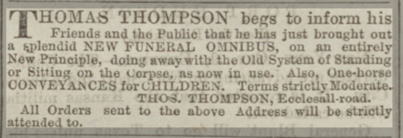 Shillibeers were a patented design and so only available from appointed agents such as T Morton. This vehicle, patented by George Shillibeer (1797-1866), combined space for both the mourners and the coffin. George Shillibeer was the first designer of horsedrawn coaches which transported large numbers of people, the forerunner to omnibuses. He had an eventful life, was imprisoned for not paying his taxes, smuggled French brandy, and spent some time in a debtors’ prison. After his release he adapted these large vehicles to include accommodation for the hearse as well as the mourners. This new form of vehicle reduced the cost of a funeral for the family. ‘Shillibeer’s Funeral Coaches’ were in common enough use in the early Victorian period for funerals to be described as ‘Shillibeer’ funerals. Shillibeer himself spent the last few years of life in the undertaking business, and indeed one of his hearses was exhibited at the Great Exhibition of 1851.