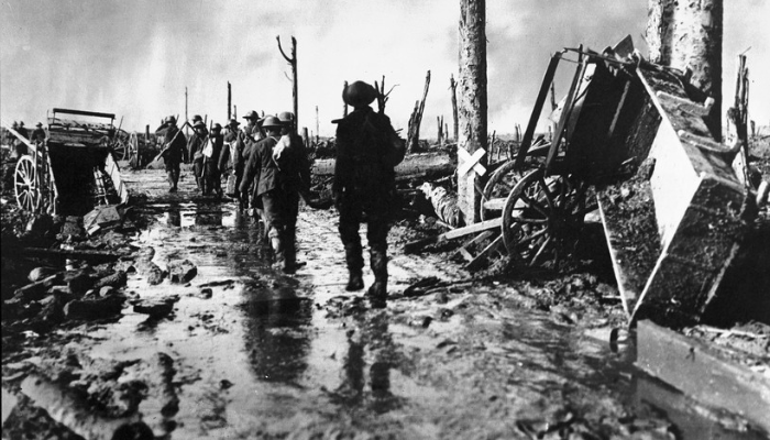 Troops moving over a plank road, near Idiots Corner during the Third Battle of Ypres, 1917. Source: National Library of Australia.